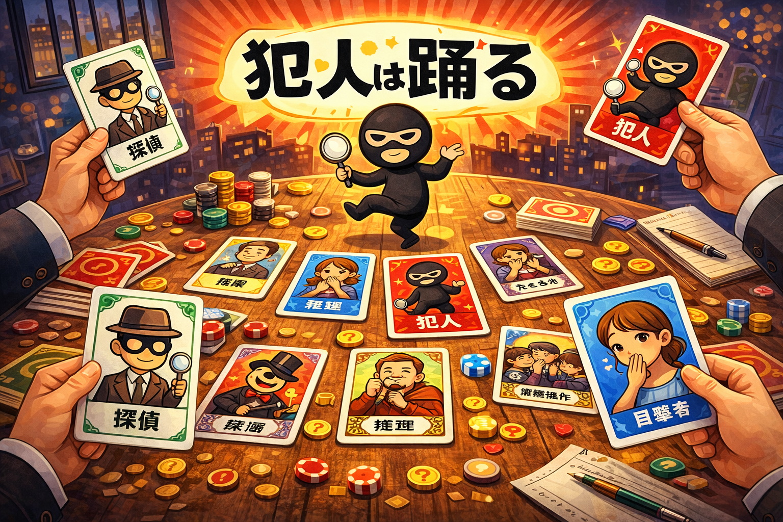 犯人は踊るは、カードを回しながら「犯人」を押し付け合う正体隠匿系カードゲームです。